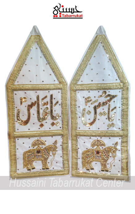 Beautiful “Ya Hussain a.s & Ya Abbas a.s Two Alam Patka With Zuljanah ” crafted with fine golden handwork and a clean, elegant border.